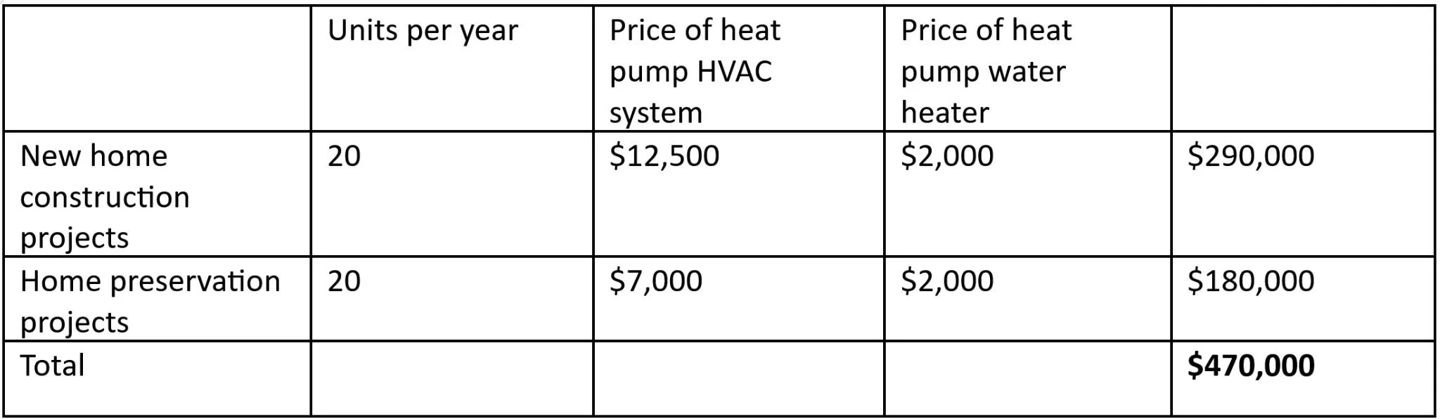Tacoma Habitat currently installs heat pumps in all of our new construction projects and many of our home preservation projects. To install a heat pump during a renovation costs Tacoma Habitat approximately $7000; installing the entire system in a new home can range from $10,000-$15,000 per unit. Heat pump water heaters cost about $2000 to install. Based on these prices, we can see the approximate cost of installing energy efficient appliances in all Habitat homes for one year: